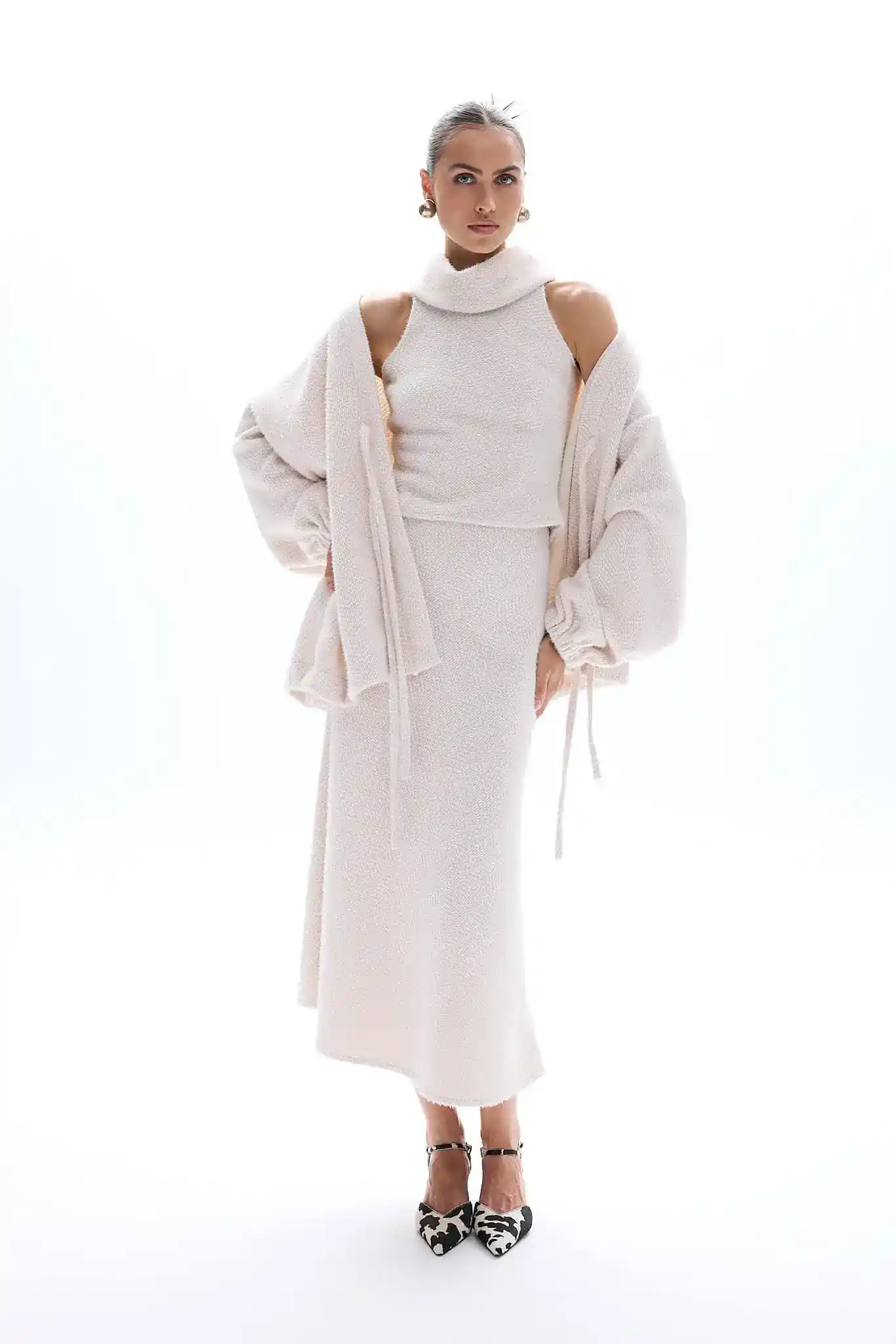 Wrap yourself in the cozy sophistication of the season with this oversized cardigan. Crafted from a premium wool blend, it offers exceptional softness and warmth while maintaining a fluid, lightweight feel. Its relaxed silhouette and wrap design subtly define the waist, creating an effortless hourglass effect. Perfect for layering over tailored trousers, denim, or the matching Ifi Off-White Top and Skirt, it embodies understated luxury and timeless versatility.