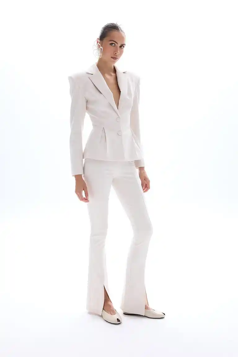 Designed to complement the matching Nadia Blazer, these slim-fit trousers are cut from 87% recycled polyester and 13% spandex, offering structure with fluid comfort. The high-waisted design elongates the silhouette, while front slits at the hem add a modern, architectural touch. Perfectly balancing elegance and ease, the Nadia Pants transition seamlessly from refined office wear to evening sophistication.