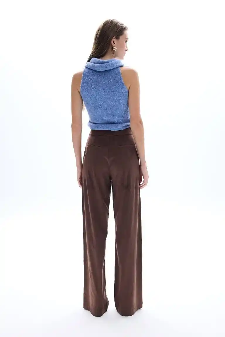 Crafted from a soft, suede-effect fabric, the Odette Suede Brown Pants blend comfort and sophistication. Designed with a high-rise waist and elegant wide-leg cut, they elongate the silhouette while offering effortless movement. The subtle stretch and matte texture enhance their luxurious feel, making them a versatile staple for both day and night.
